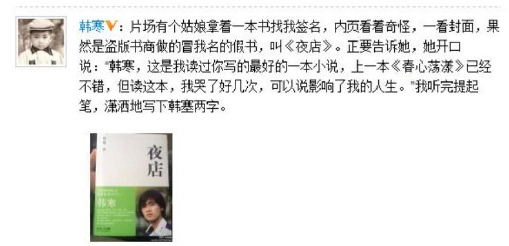 说起韩寒,当年真的算是“顶级流量”,虽然说当年还没有流量的概念,但是当年视韩寒为偶像的粉丝还是非常多的,甚至有不少“脑残粉”,比如说学韩寒退学之类的,不知道多年后,这些粉丝是否会后悔,现在韩寒更为人熟知的身份是赛车手和导演,那么韩寒为什么不写书了? 因为顶着天才作家的名头出道,所以韩寒一举一动都非常受关注,曾经也是作家富豪榜上的常客,但是在2012年,韩寒被曝出代笔风波,说他的书其实是他父亲代写的,一时间让韩寒陷入了巨大的争议中,直到现在还有人觉得韩寒的书不是自己写的,是找人代笔,这也是韩寒身上最大的黑历史之一。 代笔风波后,韩寒就基本不写小说了,最多就是写一些短评或者散笔,很多人都觉得他是因为代笔风波而不写书的,但韩寒曾经说过,自己是因为写的东西不是自己想要的,所以才会不再写书的,实际上韩寒这些年,从赛车手到导演,都做的风生水起,名利双收的他也不需要写书了。 韩寒曾经在某次签售会上,遇到一位粉丝拿着盗版书让他签名,韩寒玩心大起,直接在书上签了“韩塞”的大名,后来这就成为来了韩寒的外号。而夹子和久夹,是属于虎扑韩涵的外号,韩涵是一位游戏主播,因为遭前女友爆料私生活混乱而被称为“虎扑罗志祥”,其中曝光的韩涵录音中有句“夹死我了”,而被网友称为夹子或者久夹,这位韩涵和韩寒并没有什么关系,只是名字相似而已。