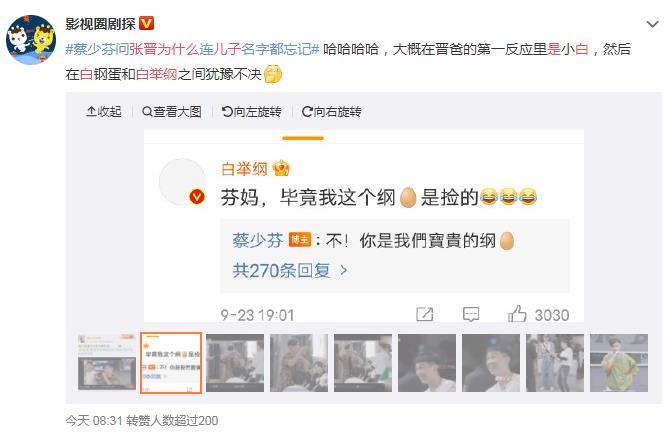 在最新一期《披荆斩棘的哥哥》背人名游戏中,张晋可以流利的喊出节目组嘉宾的名字,唯独到了白举纲这里的时候卡壳了,一开始说“小白”,想了半天才记起来是“白举纲”,对此蔡少芬直接微博吐槽道:“為什麼連兒子名字都忘記。。。嘿。。。”。那么为什么蔡少芬说白举纲是蔡少芬的儿子呢??原来在节目上,张晋曾把自己、白举纲、高瀚宇称为“父子组”,因为张晋是1974年出生的,在年龄上比他们两个人都大了小20岁,此外三个人在节目上的关系非常亲密。