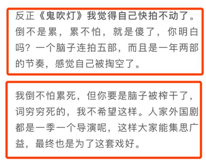 《云南虫谷》在大家的评论中完结了,虽然对比前面几部是出现了一些毛病,像是潘粤明的油腻,剧情台词的小尬等等,但总体还是很不错的,网友们中肯的觉得这部拍的也过关了,接下来就是坐等费振翔导演拍后面的了,然而但是等来了费振翔似乎不打算再拍下去的消息,这让人太难接受了,话说费振翔鬼吹灯拍了几部?他为什么不拍昆仑神宫了。 费振翔鬼吹灯拍了几部? 费振翔《鬼吹灯》拍了四部了,分别是《鬼吹灯之黄皮子坟》、《鬼吹灯之怒晴湘西》、《鬼吹灯之龙岭迷窟》、《鬼吹灯之云南虫谷》。其中最受好评的就是前面的黄皮子坟和怒晴湘西,以及龙岭迷窟了,这几部坚实了大家对费振翔拍《鬼吹灯》的信心,觉得他能拍出大家心目中的鬼吹灯。 费振翔也确实没有辜负大家的期望,在他的执导之下,不论是演员还是剧情,台词,场景,特效等等都十分还原,没有一点敷衍。其中演员们更是凭借这部剧,收获了众多好评,潘粤明一跃也成为了观众心目中最佳胡八一,张雨绮更是和潘粤明CP感十足,观众十分带感,演员十分上戏,费振翔的这版《鬼吹灯》深得人心。 他为什么不拍昆仑神宫了 费振翔没有不打算拍《昆仑神宫》,最新的消息是大概寒假就能上映了。但要说不打算拍的心思,费导确实有,非但是《昆仑神宫》,就连《南海归墟》都不打算拍了,据费振翔之前被采访的时候就讲到之所以不打算拍了,是因为不知道后面该怎么拍。 费振翔导演对作品的高要求,使得前面几部《鬼吹灯》收效颇佳,但是随着原著剧情的越来越天马行空,要实现的场景越来越难,这都让费振翔看到了难度,非是决心能完成的,经过前面几部的洗礼,费振翔觉得拍不动了,傻了,被掏空了。但这些也都是在采访时吐吐槽,具体的看他的直播,行动上并没有落下。