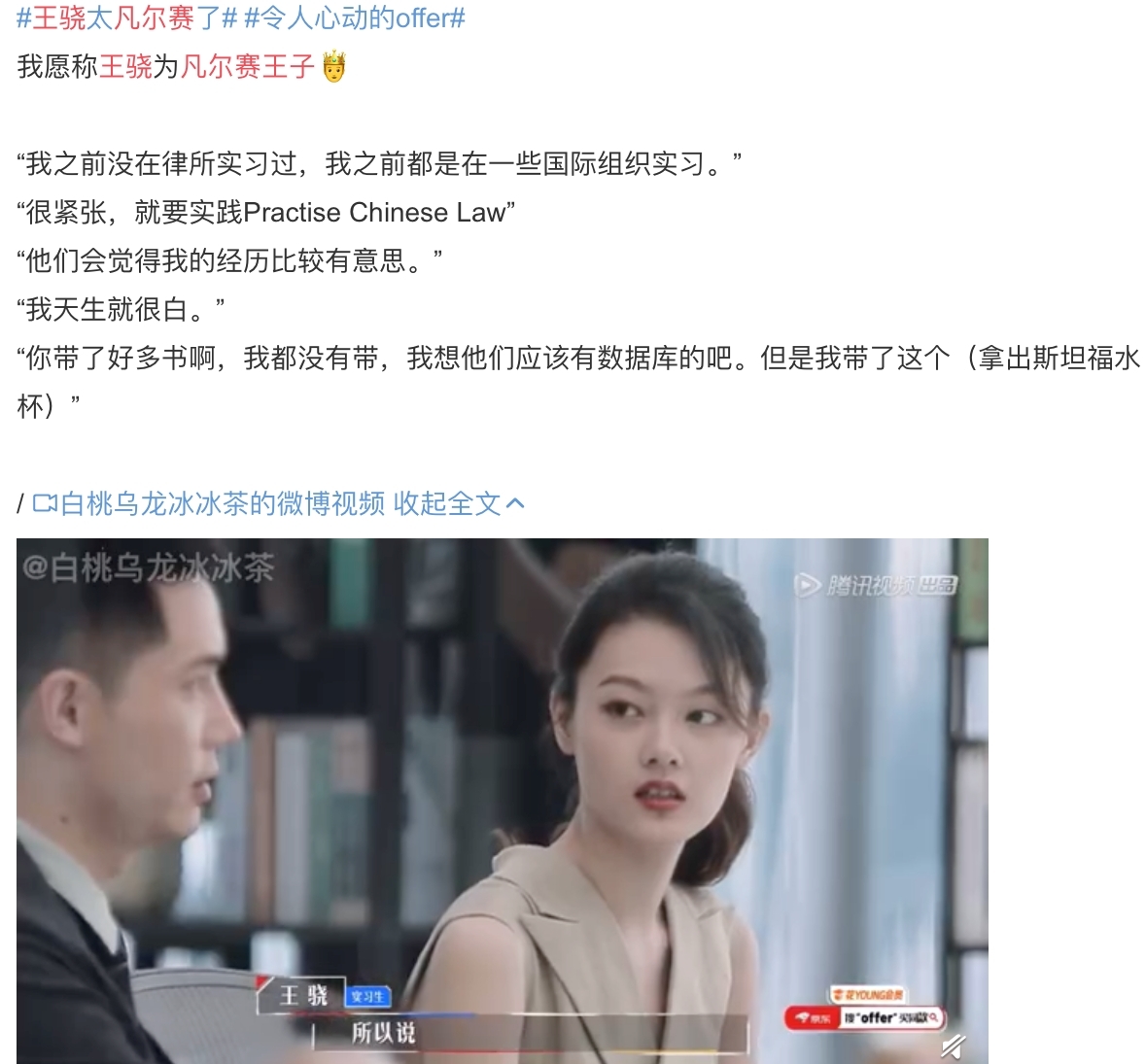 被称为凡尔赛鼻祖的撒贝宁,“北大还行”引起了网友的热议,也让撒贝宁的梗多了一个,其实撒贝宁本身就是很有观众缘的,因此很多人都喜欢撒贝宁的凡尔赛,但并不是所有人都适合凡尔赛的,这种凡尔赛可能会让人觉得是炫耀,因此招致网友的恶感,王骁就是最典型的例子。 在《令人行动的offer》中,王骁和撒贝宁相遇了,作为一位高学历素质人才,王骁给人的感觉就是无时无刻的不在炫耀,但他本人说自己只是实话实说,这种说话方式还是很容易引起争论的,比如说有人觉得王骁是在炫耀,也有人觉得他是本身实力强,所以才会那么凡尔赛。 自从进入《令人行动的offer》开始,王骁就把斯坦福挂在嘴边,尽管他只是在斯坦福待了十个月,但是却不断提起,从斯坦福的水杯到T恤,再到工牌上的带子、手机,可以说斯坦福周边非常齐全,再加上他的一些言行,被网友戏称为凡尔赛王子。再加上他的一些行为略显女气,也有一些网友称他为“王姐”。 可能很多人都发现了,王骁这个名字总是和杨幂联系在一起的,那么他和杨幂是什么关系?其实此王骁非彼王骁,《令人行动的offer》中的王骁,是一位高材生,而杨幂签约的艺人,是艺人王骁,曾经出演过《三生三世十里桃花》中的司命,是一位70后,年纪比凡尔赛王子大一些,所以杨幂签约的艺人并不是凡尔赛王子王骁,他也不是杨幂旗下艺人。