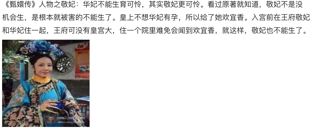 在剧中,早期的后宫嫔妃,因为华妃的迫害,过得都非常凄惨,比如说端妃和敬妃,就像是一抹影子一样,在后宫中被众人遗忘,只有用到的时候才会想到她们,尤其是敬妃,她一直是没有争宠的心的,但就算是如此,也免不了被人针对,比如说甄嬛后宫后,皇后就为了逼迫甄嬛,利用敬妃告发了槿汐和苏培盛对食之事。 这件事发生在第59集,因为甄嬛回宫,让敬妃觉得抱养在身边的甄嬛的亲生女儿,可能会被夺走,所以危机感爆发,选择在这之前投靠皇后,背叛了甄嬛,后来在第61集的时候,甄嬛和敬妃彼此坦诚,最终握手言和,只能说敬妃真的太重视养女了,真的把养女当成自己的亲生女儿来照顾。 很多人都好奇,敬妃为什么没有生育?这要从华妃开始说起,华妃因为家世的原因,所以皇帝不允许她生下孩子,因此赏赐给华妃欢宜香,欢宜香闻久了是无法怀孕的,因为敬妃早期是和华妃在一起住的,所以敬妃闻久了,也渐渐失去了生育的能力,所以敬妃才会心如死灰,靠数寝殿中的砖石度日。 ![]() |
