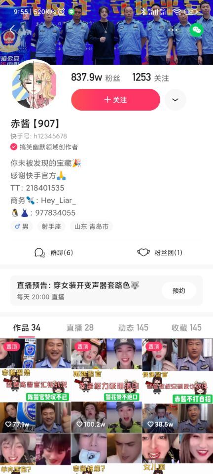 赤酱,抖音著名女装大佬,曾经在跟反诈民警陈警官连线的时候,“摘掉头套,双手举起跪地求饶”,当时的场景超级搞笑,如下图: