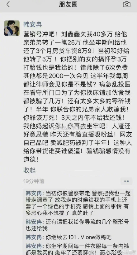 下面是韩安冉的爆料,她在朋友圈称呼刘允浩是刘鑫鑫。 ![]() 然后刘允浩(刘鑫鑫)很快便在微博上透漏自己将要爆料韩安冉的一些内幕消息 ![]() 韩安冉的爆料你还提到了刘允浩坐过牢,根据爆料来看,刘允浩做了半年牢。坐牢的原因是两个人卖减肥产品没把好关(估计是假货),然后给抓起来了。 下面是韩安冉详细的爆料: ![]() ![]() |