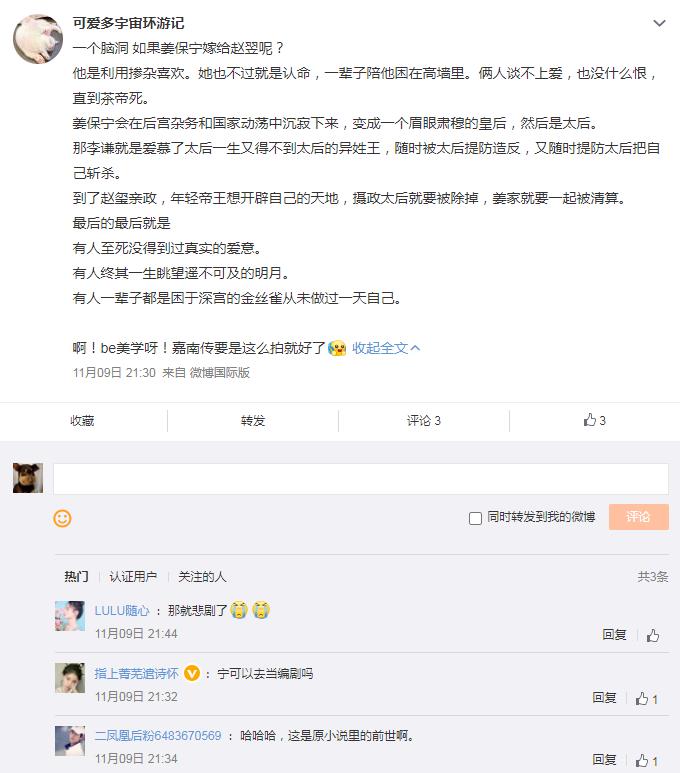 ![]() 姜保宁在剧中的经历可以说一波三折,因为她的到来,让高妙容吃醋不以,她不仅偷偷利用姜保宁的身份在地下钱庄借了很多钱谋私,在事情暴露后,她嫉恨姜保宁,于是趁李谦不在,偷偷的在姜保宁的房间中放了迷魂香,然后排了个野男人去玷污她,中了迷魂香的姜保宁瘫软在床上,幸亏危急时刻李谦及时赶到,将野男人一顿胖揍,所以姜保宁最终没有被玷污。 ![]() 目前《嘉南传》中的姜保宁已经马上要开启“副业”,做监国公主了。剧中,姜保宁自小便是由太皇太后抚养,不管是太皇太后还是李家的里里外外都护着她,而皇母娘娘不知所踪,太后娘娘和陛下薨了,姜保宁万众瞩目下朝服加身,霸气携小皇子赵玺上朝!成功开启监国副本!