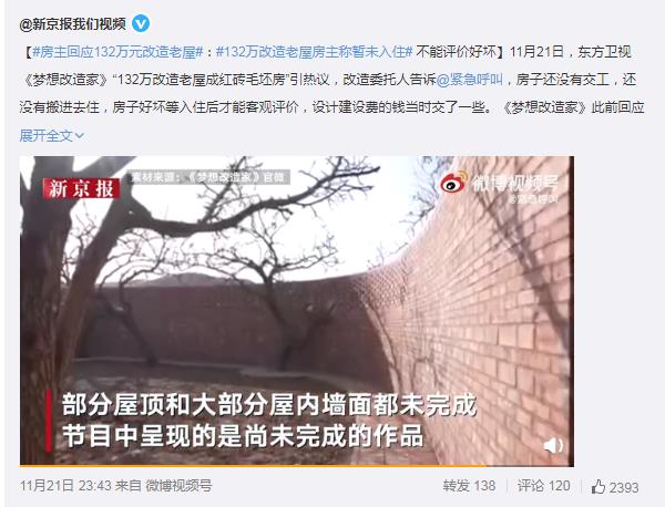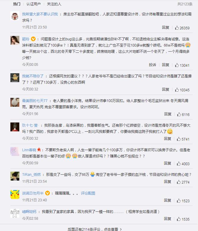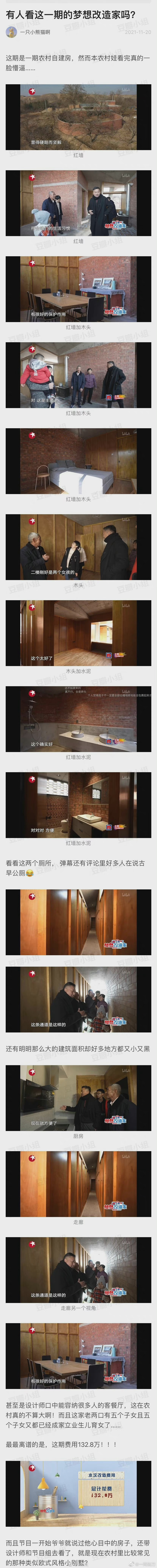 ![]() 不过很快杜兴昌老人和节目组都出来回应了,房子目前因为疫情、冬季的缘故,没有完工,等来年春季会接着开工继续干,至于房子改造的好与坏,等住进去再说,现在说有点早了。 ![]() 而“梦想改造家翻车设计师”事件也正是网友们说的这一期节目,是《梦想改造家》第八季“二十个人的空巢之家”,本期的建筑设计师是陶磊,下面是网友们的吐槽.