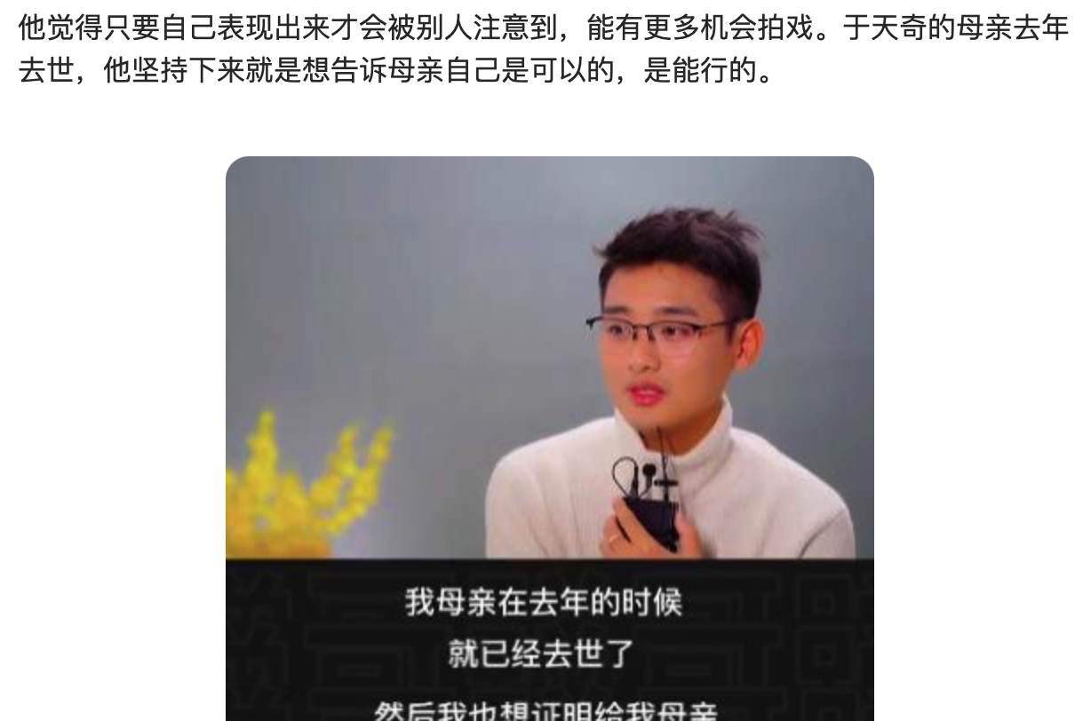 追星是很多年轻人时下的一种娱乐方式,当然也有很多人是不赞成未成年追星的,毕竟娱乐圈的明星都是包装过的,他们真实的样子粉丝是看不到的,随遇追星是有一定的风险的,因为你不知道,自己的偶像到底是人品不好、还是素质低下、甚至可能是法制咖。 相对于有些名气的艺人来说,一些默默无闻的演员才是最惨的,他们最好的年华都在拍场度过,但可惜的是却一直没有名气,只能在影视剧中打酱油,比如说于天奇,如果不是他经常出现在明星的评论区留言,估计很多人都不知道他,那么于天奇为什么喜欢蹭流量? 于天奇在抖音平台有自己的账号,在别的明星和名人发布动态后,于天奇总是会去评论,而且都是在前排,因此招致了很多粉丝的不满,称于天奇为“蹭哥”,就算是如此,于天奇也有几十万的粉丝,所以说现在的网友真的是口味独特,而于天奇之所以蹭流量,据他自己所说,就是喜欢被别人注意到,能有更多的机会接到戏拍,也就是他就是为了蹭热度。 其实于天奇的起点是不错的,他毕业于北京电影学院,曾经加入过《燕子李三》团队,后来又加入《爱笑会议室》,但因为出演的都是配角,所以很多人都不知道,于天奇出演过的电视剧有《我在未来等你》、《平凡岁月》和《我的邻居长不大》,电影有《青年F4》和《毕业旅行之逍遥骑士》等,前段时间于天奇宣布自己要放弃做演员了,因为觉得这个行业不适合自己,因此想要退出,不过也不知道他说的是真是假,让我们拭目以待。