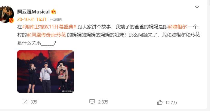 腾格尔的《天堂》,玲花的《月亮之上》都是经典歌曲,这样的两人看上去毫无联系,其实他们都是蒙古族亲戚,有一次在节目上的时候,玲花就表示自己和腾格尔是有些亲戚关系的,这让人有点惊讶,但是也很好奇,这两人看上去一点不搭边是什么亲戚关系,腾格尔是玲花的舅舅吗,腾格尔玲花阿云嘎是啥关系? 腾格尔是玲花的舅舅吗, 腾格尔是玲花的舅舅,是这样的,玲花曾经在很多节目上表示自己和腾格尔是有一些亲戚关系的,但是扯的有点远,不是很亲的那种,腾格尔倒是很准确的说自己有一个表哥是玲花的姨夫,这样算来下,玲花将腾格尔怎么称呼还真的不是很算的清,估计很多网友表示自己要去超市门口再摇两圈先。 反正就是这样一个亲戚关系吧,有网友算了算表示玲花要将腾格尔叫舅舅,玲花自己也说自己逢年是要去腾格尔家磕头的。那么就是玲花比腾格尔辈分低,腾格尔是玲花妈妈那边的亲戚,应该是可以称呼舅舅的,不过玲花倒是没有当众这样称呼过。 腾格尔玲花阿云嘎是啥关系? 腾格尔和玲花是亲戚,喊舅舅,过年要去拜年磕头的那种关系,玲花和阿云嘎的关系也不浅,阿云嘎嫂子的奶奶是玲花的外曾祖母,这个关系更要先捋捋,应该是比玲花的辈分大一辈的吧,不过好在离得远,不用玲花过年去拜年的那种亲戚,不然玲花估计有点郁闷了。 阿云嘎曾公开过自己和玲花还有腾格尔的亲戚关系,只是这个亲戚有点绕,之前在微博上给网友们出难题,阿云嘎嫂子的爸爸的妈妈是跟腾格尔一个村的,是玲花的妈妈的妈妈的妈妈的姐妹!所以阿云嘎和腾格尔和玲花就是亲戚关系吧,别为难我们亲戚少的网友们了。