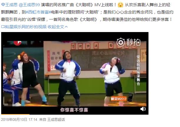王成思令人印象深刻的一位演员,在《西虹市首富》这部影片中,他扮演的“大聪明”非常出彩,剧中他的扮相给人的感觉像“弱智”,脑子不那么灵光,为了喜剧效果,被取名“大聪明”。趁着这个角色的火爆,王成思发布了一首同名角色歌《大聪明》。
