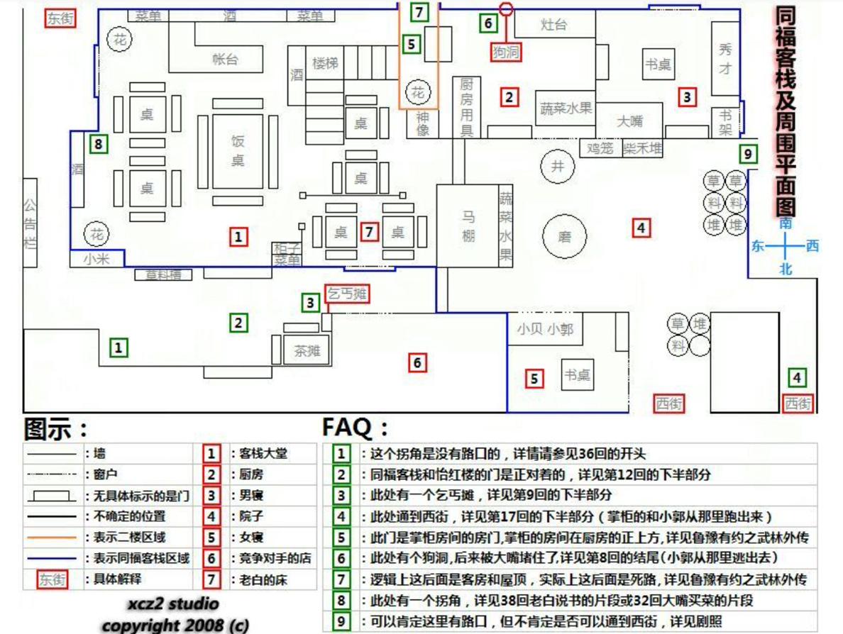 其实《武林外传》的整个故事构架,都是围绕着关中地区七侠镇中的同福客栈展开的,佟湘玉是同福客栈的掌柜,白展堂是同福客栈的跑堂,秀才和小郭分别是账房和打杂的,还有厨子大嘴和五岳盟主莫小贝,相信很多人都对同福客栈有着别样的感情,总觉得有个地方,真的有这么一群人,过着快乐的生活。 据说《武林外传》在拍摄的时候是非常艰难的,所以剧组都是能省则省,布景也是非常简单的,而同福客栈的原址,就是在北京市平谷郊区的飞龙影视基地,当初专门搭建了一个“同福客栈”,不过后来因为原址变得杂草丛生,所以被拆除了,现在已经没有了。 不过在江西省有个还原版的“同福客栈”,因为是一比一还原的,所以和原来的同福客栈很相像,因此吸引了大批游客,就连石磨、水井和告示都一一还原了,还有一些周边也非常受欢迎,可能是情怀的原因,很多人都对《武林外传》有着不一样的感情,虽然说《武林外传》不可能有续集了,但依然有人觉得他们的故事未完待续,在某个地方还在继续上演着。 同福客栈平面图 |