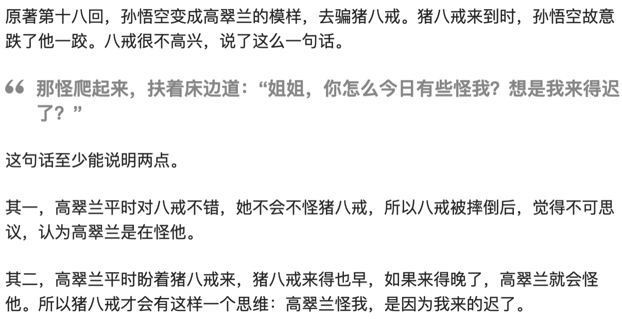 说起《西游记》,相信每个人都是耳熟能详的,除了《西游记》原著外,还有很多衍生作品,尤其是猪八戒,这个性格鲜明的人物,一直被认为是非常痴情的存在,所以在《春光灿烂猪八戒》中,人们惋惜他和小龙女的爱情,在《福星高照猪八戒》中,他和锦毛鼠的有缘无份也让人唏嘘不已,而在原著中,和猪八戒有感情纠葛的也有不少,比如说高翠兰。 在《西游记》中,猪八戒原本是天庭的天蓬元帅,掌管天河十万天兵,但因为调戏嫦娥仙子,而被玉帝贬下凡间,阴差阳错之下投身猪胎,成了一名猪妖。并且在机缘巧合之下,成为高老庄高员外三女儿高翠兰的相公,后来被孙悟空降服,跟随唐三藏去西天取经,不过很多人都好奇,高翠兰喜欢过猪八戒吗? 从剧中不难看出,高翠兰和猪八戒还是有感情的,毕竟他们相处了不短的时间,而且一开始猪八戒是以农夫的形象现身,虽然后来变成了猪妖,但古代女子都是遵从“嫁鸡随鸡嫁狗随狗”的,再加上孙悟空假扮高翠兰时,从谈话中可以看出,他们之间相处也是非常和谐的,再加上猪八戒对高翠兰也是挺好的,除了长得难看点,猪八戒也算是个好丈夫,所以高翠兰才会喜欢上猪八戒。 网上有一种说法,说高翠兰是嫦娥的化身,但这只是网友猜测而已,原著中并没有提到,所以高翠兰并不是嫦娥。猪八戒心心念念的一直是嫦娥,这是他的求而不得,但他娶的却是高小姐高翠兰,这大概就是梦想和现实的区别,嫦娥是天上的仙子,而高翠兰却只是凡人女子,所以对于高小姐的结局,也就不难猜测了,估计除了孤独终老或者青灯古佛外,基本上没有其他的结局了。