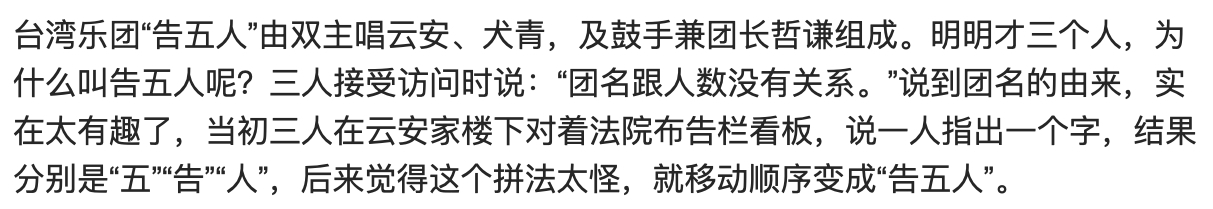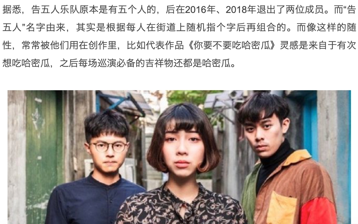 其实不怎么听歌的人,对五条人和告五人都不太了解,甚至以为这是同一支乐队,也许是因为缘分,他们被网友认识,都是因为《乐队的夏天》这档综艺,不过和五条人比起来,告五人乐队名气要小得多,毕竟这支乐队太过“年轻”,直到前段时间才在内地打开了知名度。 告五人乐队成立于2017年,次年就获得金音创作奖最佳新人,后来还获得了金曲奖最佳新人提名、最佳乐团提名等,组合成员一共有三个人,潘云安、犬青和哲谦,其中犬青是位女主唱,其实很多人都觉得奇怪,为什么三个人的乐队要叫“告五人”? 据告五人的三位成员所说,他们在最初成立乐队的时候,都是非常随性的,因此名字取得也很随便,当时他们在潘云安楼下取名,就对着法院布告栏,然后每个人只一个字,就变成了现在的“告五人”。也有一种说法是告五人曾经是有五个成员,但后来经历大换血,有两位成员退出,才变成了只有三个成员,也不知道是真是假。那么告五人和五条人有哪些区别? 告五人是台湾乐队,而五条人则是内地的,五条人成立2008年,要比告五人乐队早很多,成员一共有两人,这支乐队在广东地区的知名度一直不低,而且最重要的是,五条人是一支民谣乐队,被称为“草根音乐”,融入了一些潮州方言和粤语,是很小众的乐队,而告五人乐队则玩的是流行音乐,再加上曲风多元,因此更受年轻人喜欢和追捧。