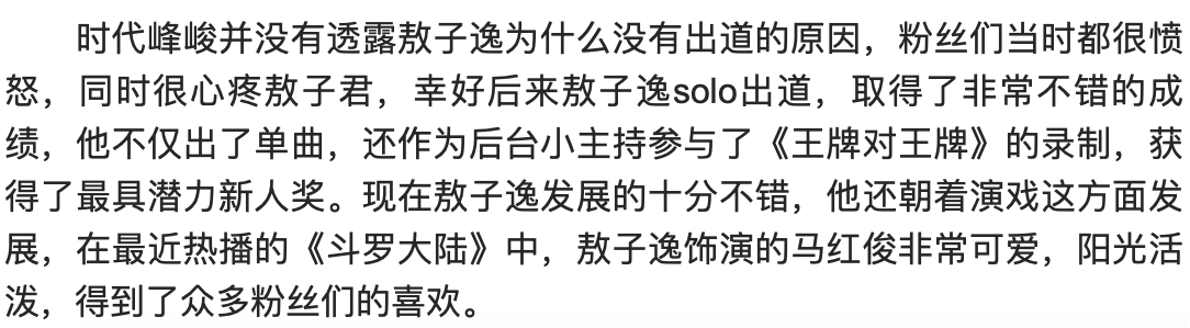 帝国三子是网友对tfboys起的外号,这三个少年可以说是被网友看着长大的,因此国民度在一众流量艺人中,可以说是一骑绝尘,后来帝国三子分开发展,让团粉十分惋惜,因此不少粉丝开始转而喜欢二代团,当初二代团也是命运多舛,经过数次试验,才有了现在的时代少年团。 可以说时代少年团是被三小只一路“奶大”的,但是粉丝们对此不以为意,还觉得经纪公司不给力,其实时代峰峻这个公司,对手下艺人一向是非常苛刻的,当年的三小只如此,台风四子也是如此,比如说早前在十八楼名气很大的敖子逸,现在都快被网友遗忘了。 敖子逸在13年的时候进入时代峰峻的,算是元老级的练习生,当初风光无限的敖子逸,大概也没有想到,自己竟然会被时代峰峻放弃,曾经有段时间,网传敖子逸被公司雪藏了,所以他没能加入台风少年团,因此后来的时代少年团,自然也就没有了他的身影,对于他不能入团的原因,公司也没有给出明确的说法,后来敖子逸solo出道,出了单曲,也参加了不少影视剧的拍摄。 网上一直有传闻说敖子逸被时代峰峻放弃了,有段时间都说敖子逸被外包了,后来敖子逸solo出道,并没有引起太多的关注,他出演的也大都是小配角,虽然说敖子逸的粉丝都对时代峰峻不满,觉得他们对敖子逸非常差,但直到现在,他依然是时代峰峻旗下的艺人,前段时间他主演的《斗罗大陆》播出后,收获了一波热度,希望他能越来越好吧。