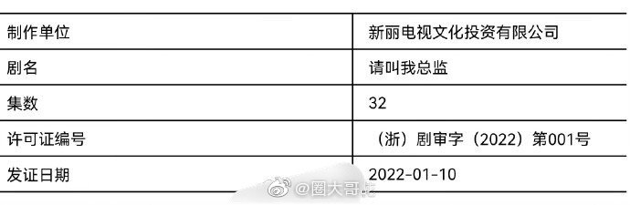 ![]() 下面是《请叫我总监》过审获得的发行许可证,该剧在2021年3月份开机,预计在2022年第一季度播出。《请叫我总监》这部剧改编自红九的同名网络《请叫我总监》,由姚婷婷、杨同坤执导,胡非子、仲宁、陈澍玲和周游担任编剧,林更新、谭松韵、刘畅、苏鑫、王秀竹等主演。剧中,宁檬(谭松韵)一直有一个成为投资总监的职业梦想,但是她的上司陆既明(林更新)不认为她能成为一名合格的总监,终于有一天宁檬决定离开陆既明重新找工作,来证明自己可以,最终她入职鹰石投资,经历了无数的波折和风浪之后,宁檬蜕变成为了独当一面的金牌投资人,陆既明也历练得更加成熟有担当,两人最终终成眷属。 ![]() |