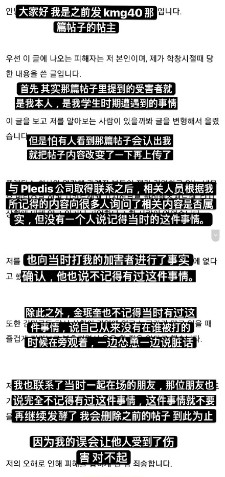 金珉奎,SEVENTEEN Hiphop队的门面小花树。全能小王子,修理电器、设计、料理样样都行,总爱说一些让人心动肉麻的话但是其实自己也很害羞。在1月14日的一次直播上,金珉奎给大家来了一次现场卸妆直播,卸妆前后的金珉奎竟然没什么变化,颜值确实很能打了,难怪网友调侃道“这是卸了个寂寞”,下面是卸妆前后对比照: 大家好,这里是Pledis Ent。 针对最近在网络上传播的,关于SEVENTEEN成员珉奎学生时期相关事件的主张,在此传达我司的立场。 首先,就我司没能更快的发表立场而向大家致歉。 这次在网络上传播的一些主张,我司首先需要向艺人本人进行确认,除此之外还进行了一些其他必要的确认事项。在此过程中,我司确认了在网络上传播的内容与向艺人本人确认的内容之间存在差异。 目前,校园暴力相关的事例层出不穷,并成为社会关注的焦点。我司判断,针对这些事例应首先确认相关事件的真相,而目前所有相关事项都在确认中,在这样的过程中不得已迟来的发表立场,再次表达我司的歉意。 就像之前告知大家的,我司为确认事实真相进行了多方面的调查和取证,与事件当事人取得联系,目前联系还在持续进行中。针对当时的情况向艺人的同学们,以及周边的熟人们进行了多方的取证。 截至目前我司已经确认的内容,首先可以向大家保证的就是,对于艺人霸凌残疾人校友的主张绝对不是事实。 艺人本人对被指为是“受害者”的该位校友有着非常明确的记忆,并打听到了该当事人的母亲,与其取得了联系。经当事人母亲确认,被指为是“受害者”的该位校友反而与艺人是非常和睦友好的关系。当事人母亲,对当时在学校里欺负自己孩子的学生姓名也有着明确的记忆,关于这部分内容当事人母亲当场予以了确认。 目前,被指为是“受害者”的该位当事人正在很好的经营着自己的社会生活,对于自己过去的事情,在未经本人同意的前提下,以自己不愿意的方式被公开,而倍感负担。但即使是这样,当事人还是选择帮助艺人确认事实真相。 对于其他事项,我司正在进行积极的确认中。但有些事项的上传者很难确认其真实身份,另外一些内容,文章作者曾公开表示不希望再取得联系,因此直接接触当事人非常困难,我司也很慎重。 我司尊重有些文章作者不愿意露面的个人意愿,同时如果对方愿意,不论何时,不论以何种方式,我司都愿意与对方见面,坦诚交谈调查清楚事实真相。 我司认为,在目前校园暴力成为社会性问题的情况下,确实应该充分考虑所谓受害者的主张。但我司判断,在所谓受害者的主张和事实真相确认后,应该采取相应的措施。 现在出现争论的内容,是艺人在小学以及初中时所发生的事情,所以我司为了确认事实真相,需要时间进行接触和判断。 艺人本人,就此次事件发生的本身给粉丝们带去不便,而真心感到抱歉,目前决定将暂时中断所有行程活动,并全权委托公司调查清楚所有事实的真相。 我司也为旗下艺人给大众带去不便而低头致歉。 我司承诺,这次公开发表的内容并非为这次事件的终点,我司将持续为确认事实真相而努力,并根据事实结果采取相应措施。但此过程并非易事,需要时间这一点也希望大家谅解。 我司会努力与主张受到伤害的所有当事人见面,确认事实真相,并认为帮助所有当事人治愈心结才是最重要的。但与此同时,未确认事实真相的事件关系着艺人的人生,因此无法轻易下结论,希望大家理解。当然,在确认了事实真相以后,如果有错误的行为存在,我司也约定大家一定会采取相应的措施。 因为我司艺人相关的事件给大众带去不便,我司再次表示歉意。 |