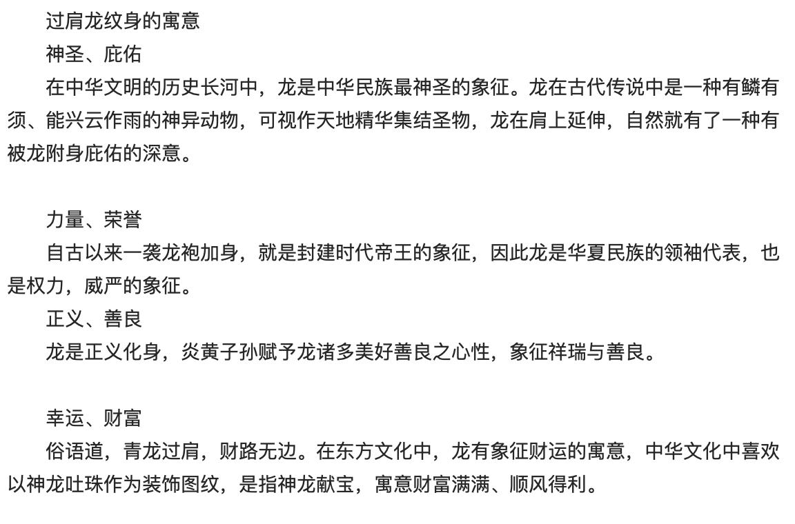 《古惑仔》在很多年前风靡一时,“浩南哥”和“山鸡哥”也成了社会人的代名词,因此当时很多年轻人都模仿《古惑仔》,比如说称呼或者发型,甚至是纹身,都知道在《古惑仔》中,陈浩南的龙形纹身十分霸气,那么这个纹身有什么寓意呢? 在电影中,陈浩南的纹身是一条从右臂到胸部的龙形图案,因为这个图案十分威猛,让很多年轻人都很喜欢,所以他们纷纷效仿,后来给这种纹身起名为过肩龙纹身,在一些传闻中,说过肩龙纹身只有帮派的老大或者很有地位的人才能纹,不知道是真是假。据说德云社的相声演员李鹤东,就曾经在社会上“混过”,所以纹着一条过肩龙纹身。那么这个传闻是真的吗? 龙在中国人的心中一直是非常神圣的,古代帝王都被认为是龙的化身,所以被称为真龙天子,所以把龙纹在身上,意味着被龙附身,表示自己很厉害,象征着力量和荣誉,而且龙还是正义的化身,所以真正的黑道人物,是不敢随便纹过肩龙的,还有句话叫做“青龙过肩,财路无边”,因此过肩龙也象征着财富和幸运。 被称为“社会东”的李鹤东,据说是有黑道背景,作为德云社的相声演员,现在的李鹤东看起来是人畜无害的,传闻中李鹤东纹着过肩龙纹身,很清晰的照片流传出来,不过他小腿上的纹身,还是可以看到的,不过据说郭德纲是禁止徒弟纹身的,所以李鹤东他们的纹身,一般都不会露出来,也有人猜测李鹤东的纹身可能以及洗掉了,至于真相到底如何,就不得而知了。 网传李鹤东过肩龙纹身图片