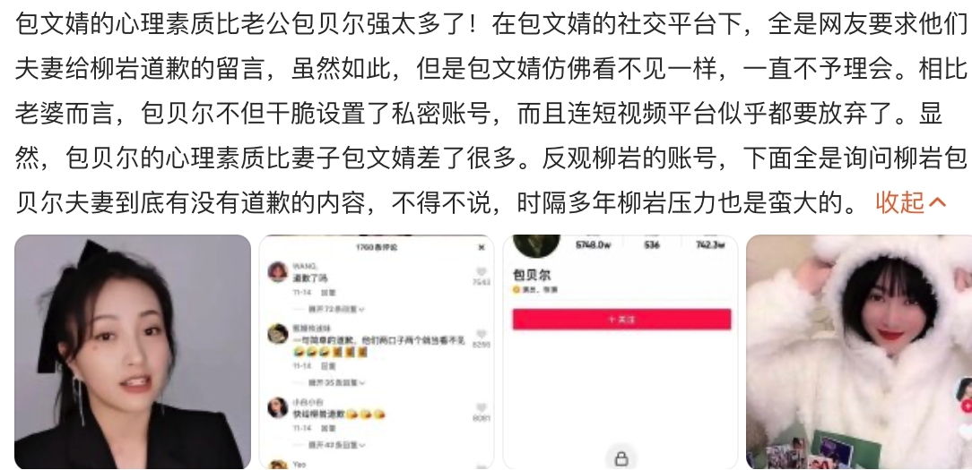 娱乐圈的风向并不是一成不变的,今天还是万千粉丝的偶像,明天就可能坠入深渊,而网友的喜欢也都是很浅薄的,可能会因为一部剧、一部综艺甚至一个动图,喜欢上一个艺人,但也可能一个似是而非的传闻,就会粉转黑,甚至却谩骂这个艺人。就像当年的柳岩伴娘事件。 可能很多人都不记得了,柳岩早期是一位主持人,并不是后来的性感女星,但自从走上性感女星这条路,柳岩的名声也就越来越不好,甚至让人忘了以前的清纯形象,提起她就是“靠胸上位”类似的评价,尤其是在包贝尔和包文婧婚礼上的闹剧,柳岩直接从受害者变为心机深沉,说她为了炒作爆出来的。 当初在包文婧和包贝尔的婚礼上,身为伴娘的柳岩被伴郎团“调戏”,甚至他们要把柳岩扔进水里,当时柳岩的穿着,进水就会走光,幸亏有贾玲阻止,后来这段视频被传到网上,人们都大骂包贝尔及其伴郎团,但后来出来道歉的,却是受害人柳岩,其实一开始包文婧,并不在网友的谩骂范围内,但后来包文婧却维护包贝尔,两人一副受委屈的样子,经常提这件事卖惨,但是对柳岩受到的伤害,却只字不提,所以网友才让包文婧对柳岩道歉。 自从伴娘事件后,柳岩的事业大受影响,这么多年才有了一些起色,但包文婧似乎是恨上了柳岩,话里话外都是自己很委屈,让网友们都看不下去了,对她和包贝尔的印象一跌再跌,因为这场婚闹,包文婧夫妇和柳岩已经形如陌路,据说是因为包贝尔曾经追过柳岩,所以包文婧才会那么讨厌柳岩,也不知道这个说法是真是假。