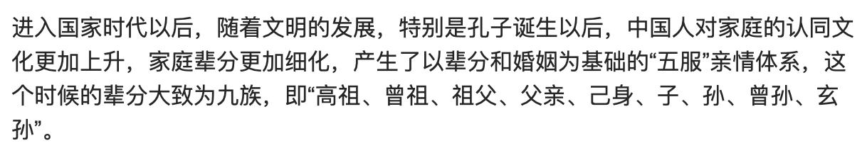氏族文化在中国有着很久远的历史,中华民族上下五千年的文明进程中,家族文化随处可见,古代宗族的影响力甚至要比朝廷还要大,因此诞生了很多具有民族特色的文化,比如说家谱、家规、五服和九族等,那么所谓的五服指的是几代人? 尊老爱幼是中华民族的传统美德,而这些文化的产生,都离不开辈分的问题,辈分决定了一个人在家族中所处的地位,是家族文化最基础的东西,这涉及到了伦理问题,就不一一细说了,因为辈分的问题,才出现了亲族体系,也就是人们常说的五服和九族,出了五服的亲戚,就已经不算是近亲了,那么出五服是几代人? 所谓的五服,指的是以自己为坐标,往上数四代人,再往下数四代人,就是高祖父母、曾祖父母、祖父母、父母、自己、儿子、孙子、曾孙和玄孙,都是在五服之内的,其实兄弟姐妹也在五服之内,只是古代以父族为尊,所以母族只能居后,简单来说,五服就是自高祖至玄孙的所有男性及其配偶,也被称为本宗九族。 五服辈分表格图解 五服之外的亲族,指的是高祖至玄孙以外的亲缘,比如说六世祖和六世孙,就是已经出了五服了,而堂曾叔伯或者堂曾孙,也是已经在五服之外,所以听起来这些很亲的族人,其实已经不算在九族之内了,古代人对于五服内的亲戚和五服外的亲戚,是不同态度的,所以宗族社会下,五服之内的关系比我们想象的要亲近得多。 五服辈分表格图解