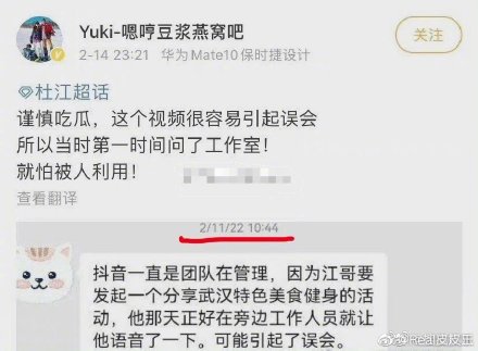 2月11日上午10点44分,粉丝私信询问工作室,杜江工作室回应称某音是团队在管理,因为杜江要分享武汉特色美食健身的活动,语音也是工作人员发的。(图4)