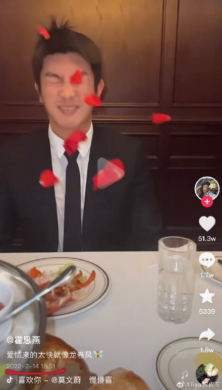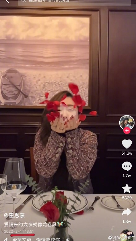 2月14日傍晚18点51分,霍思燕发布情人节吹玫瑰花飞吻的视频,并配乐《慢慢喜欢你》,大秀恩爱。(图5-6)