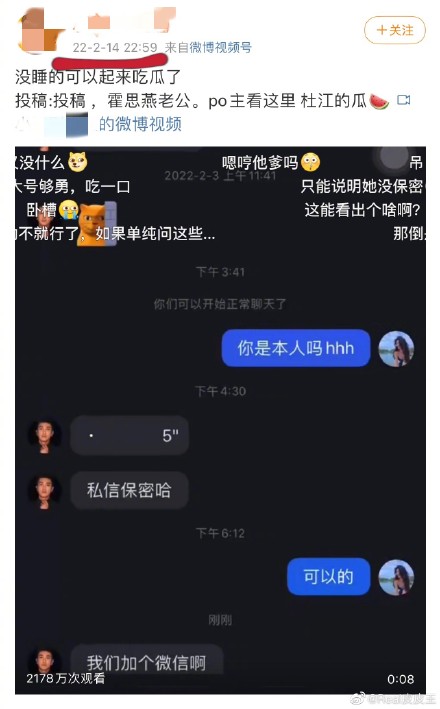 2月14日晚上22点59分,有博主开始曝光杜江与美女的聊天记录截图。(图7)