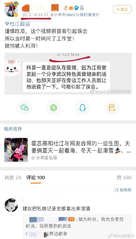 在2022年情人节当天,有网友爆出疑似杜江私聊女网红的聊天记录,女方问:“你是被人吗hhh”,他发语音说回复说:是押是押因为我三月份要去武汉拍戏,还跟女生说“我们加个微信啊”。杜江私信日期显示是2月3日,网友投稿日期2月10日,粉丝称2月11日便问了杜江团队,团队称杜江是要发起一个武汉美食健身的活动,私信也是工作人员发的。同在2月11日,杜江发dy“请把武汉好吃好玩和健身的地方发给我吧!”