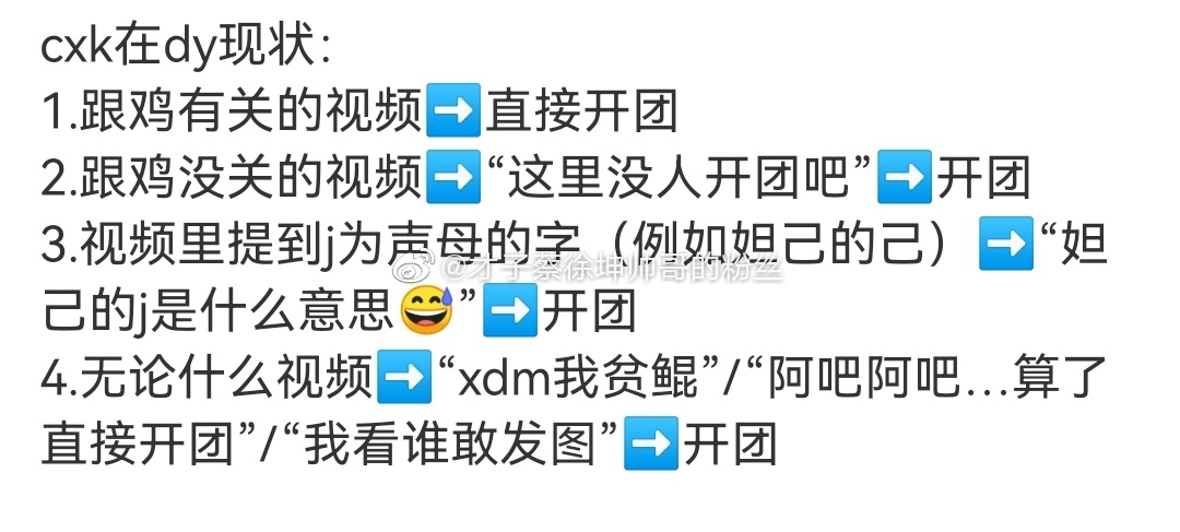 最近,痞幼发了一条“开团了”,引来大量粉丝评论区发表黑CXK的表情包,现在在社交平台只要发开团了,必然会有大量CXK的黑粉前来发一些他的表情包来黑他,目前来看大量发这种表情包的网民都是CXK的黑粉,当然也不排除一些看热闹不嫌事大的、起哄的网民。 为什么发开团了成了黑cxk的一个词呢??根据整理的资料来看,这可能是起源于抖音上一个“鸡英雄”的视频,在视频中,博主将一群鸡P成了拿着武器的英雄形象,本来视频中的鸡看起来变的“英武、潇洒”,是个拍案叫绝的好视频。 视频中一群鸡拿着武器,像极了游戏中“开团了”、“开团战”的样子,看过视频的网友就在评论区发了“开团了”。 但是有脑洞大开的网友,硬是将这群鸡,跟“鸡你太美”联系在一起了....而“鸡你太美”大家都知道是黑CXK的一个梗...于是乎...各种黑表情包随之而来。 那么为什么CXK这么多人黑呢??目前来看,还是源自于当年的哪个恶搞视频,CXK打篮球、鸡你太美这些梗,可能太过于魔性了,很多网友黑CXK纯粹是为黑而黑,他们可能连CXK有什么作品都不知道,看着别人黑,也跟着一起黑。 CXK真的有说的那么不堪吗??真的未必,好好了解下再发表结论和看法,别被带偏了,每个人仔细审视一下,都有闪光点,这些年CXK的努力和进步也是有目共睹的。