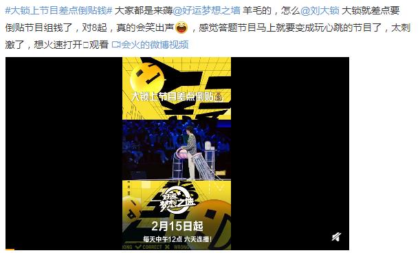 ![]() 最近,喜剧演员大锁参加《好运梦想之墙》节目时,在答题赢好运后续环节屡战屡败,甚至差点给节目倒贴钱,看起来不是一般的惨~这次大锁是带着整个团队来参加节目,打算免费拿红包解决年终奖,却差点倒贴钱。 对此,刘大锁在微博上表示: 虽然都在说大锁上节目差点倒贴钱,但哪怕是贴钱,咱们也要让大家认识认识咱们的新成员!今天借节目的东风,正式官宣“大锁编剧团队”成员!(有五险一金的那种!)感谢公司对我们内容创作者的大力支持!希望大家能多多去看他们的线下演出!也能关注我们团队后续的作品! ![]() |