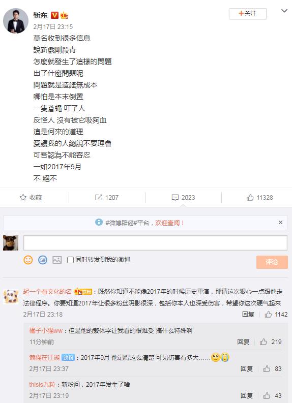 2月17日下午,有网友爆料靳东、李小冉主演的电视剧《林深见鹿》拖欠剧组几百人的工资,最后又称是财务对接出现问题,工资已结算完毕。当晚,靳东回应:“新戏刚杀青,怎么就发生了这样的问题,出了什么问题呢?问题就是造谣无成本...” 随后,靳东又发文称:“这就是他们的扭曲心态。”目前,爆料网友已将账号注销。靳东在回应的微博里面提到了“一如2017年9月的事”,而评论区的网友们纷纷留言想知道2017年9月到底发生了啥?