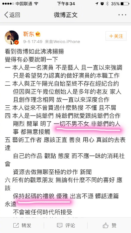 ![]() 2017年9月,靳东发了一条微博,内容如下,其中有一条提到:“本人是一纯爷们,纯爷们就爱跟纯爷们合作,刚烈、简单、明了,一切不男不女,费爷们的人事都无意接触。” 靳东为什么要发这样的微博呢??网络传言是说《金星秀》节目上,金星曾经批评靳东“饰演的角色雷同”。 ![]() 而就是这一条,找来不少网友的非议,著名社会学家李银河也发文抨击靳东的言论是对少数群体的不尊重,没教养。 此外,在2017年靳东还曾有过一次国外之行,这次国外之行跟李银河事件没什么关系,而是一次为:“为特仑苏录制第一首资料”。 ![]() |