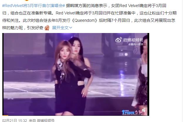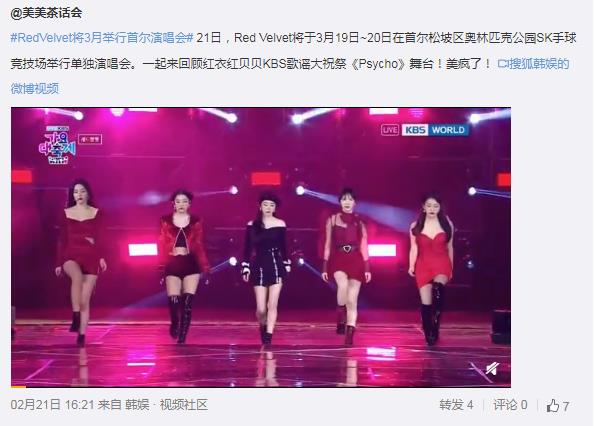 Red Velvet是韩国SM娱乐有限公司于2014年8月推出的女子演唱组合,由裴珠泫(Irene)、姜涩琪(SeulGi)、孙胜完(Wendy)、朴秀荣(Joy)、金艺琳(Yeri)5人组成。Red Velvet将于3月19日~20日在首尔松坡区奥林匹克公园SK手球竞技场举行单独演唱会。让我们共同期待!