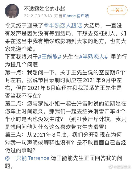 《半熟恋人》王能能和罗拉官宣后,网友“不透露姓名的小赵”说自己是王能能的前女友,说节目9月录制,8月招募嘉宾,他们8月底还在一起,而王能能在节目里说自己空窗期五个月。该网友称想要一个回应。节目上,王能能和罗拉被网友取名为“巴啦啦能量CP”,不少网友真情实感的磕这一对CP,没想到塌房这么快。
