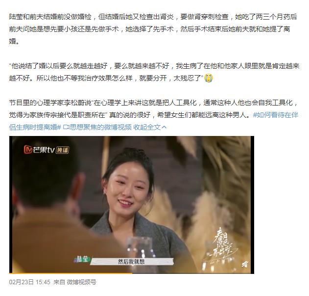 陆莹的丈夫认为,婚后的日子要么是越过越好,要么是越过越不好,而他们刚刚结婚就查出这种病,注定了两个人的婚姻会越来越差,所以执意决定要离婚。在陆莹出院第二天,前夫就找到她爸爸说要和她离婚。 ![]() 看到陆莹的遭遇,很多网友已经情感带入了,想知道陆莹的前夫是谁,首先节目上肯定不会曝光她的前夫,毕竟她前夫没有违法任何法律法规,只是可能在道德层面有所欠缺。 有网友说:“她前夫在住院期间事无巨细照顾她,直到她可以下床,已经很仁至义尽了,肾炎不可能治愈,这个选择没什么错,就不要再扒她前夫是谁了”。 ![]() 对于陆莹的前夫,节目里的心理学家李松蔚说“在心理学上来讲这就是把人工具化,通常这种人他也会自我工具化,觉得为家族传宗接代是职责所在” .