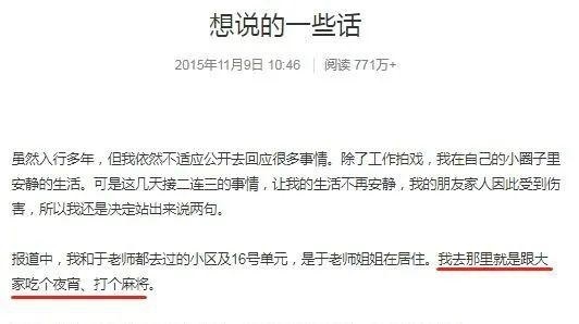 ![]() 事件的起因是这样的,2015年 王丽坤被拍到深夜进入于和伟家中两人待了一夜 直到第二天王丽坤才万般谨慎独自离去,这时候的王丽坤虽然是单身但于和伟却已经结婚多年,与已婚男士共度一晚,王丽坤是不是坐实了“第三者”的称号呢?对此,王丽坤也专门发文回应,说是去打麻将而已: ![]() 对于王丽坤的麻将事件,也有网友角度新奇说:“当晚是在于和伟家过夜的,看清楚了,"在于和伟家"。于和伟有家室,夫妇在家,朋友来访,打打麻将,又有何妨?狗仔队太无良,难怪狗仔队员被人打的事例时有发生。”” 其实如果这么理解的话,还真是,于和伟结婚了,王丽坤去于和伟家打麻将,当时于和伟的妻子也在场啊,这不就没问题了吗? 下面是于和伟姐姐的回应: ![]() 虽然王丽坤跟于和伟、林更新等人都传出过绯闻,不过网传王丽坤的老公却不是娱乐圈的人,而是一位富商,并且两个人还被拍到一起去民政局登记结婚,目前关于王丽坤是否已经结婚,没有任何实锤材料。 下面是王丽坤被拍到和富商老公从民政局走出来的画面。 ![]() |