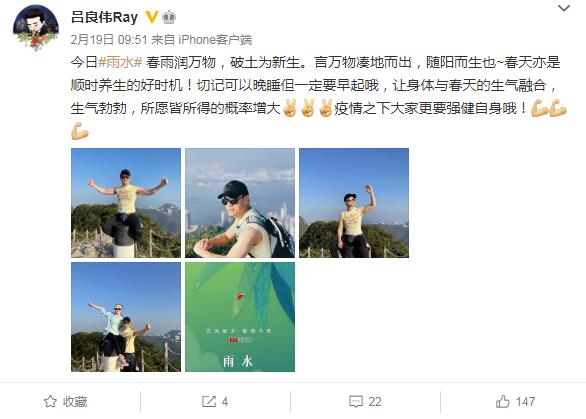2002年2月19日时,吕良伟在社交平台晒出登上照,还不忘提醒网友春天是顺时养生的好时机,在疫情之下更要强健自身。
