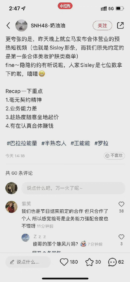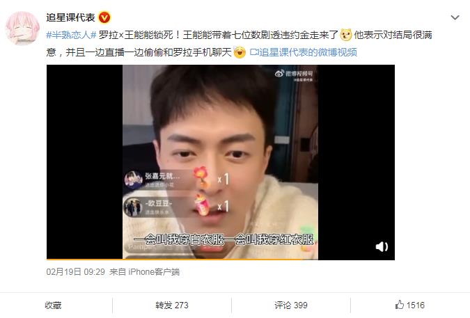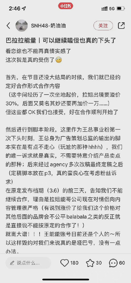 其实王能能的七位数,有2个梗: 第一、违约金的梗。 在一次直播的时候,有粉丝问他节目上到底成了几对情侣?因为节目是提前录好的,我们看到的时候,早就有结果了;所以王能能是知道节目最终的结果的,但是节目组跟王能能等人是签了保密协议的,如果对外界说的话,就会赔偿7位数的违约金。当然,在直播间里面他没有跟粉丝说最终的结果,自然也就不存在赔偿7位数违约金的问题了。 ![]() 第二、有合作方出来吐槽巴拉拉能量cp,说罗拉王能能他们没有契约精神,业务能力差,趁热度坐地起价,因为七位数合作费,跟另外一个品牌合作,下面是爆料。王能能在一开始中提到的这个7位数,应该就是对这次事件的回应。 ![]() ![]() |