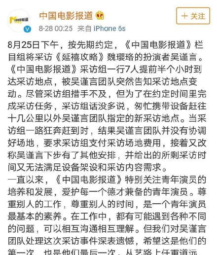 吴谨言凭借《延禧攻略》大火,但是火爆之后网络上曝出她耍大牌,被央视点名批评,2018年,六公主(中央六电影频道)突然在公众社交平台,发文控诉吴谨言人红之后耍大牌,没有艺德,完全不尊重人。六公主还将这条文案置顶,看来是被吴谨言气得不轻。随后央视网编辑文章批评吴谨言,开头关于“魏璎珞”的那一段就是央视网的点评。那段时间,出演《延禧攻略》的吴谨言风头正盛,六公主便约了吴谨言进行采访,六公主提前布置好采访地点,等待吴谨言出现。结果吴谨言临时改变主意,要求换地方,并索要采访费,六公主做出多方妥协后,吴谨言团队却以艺人时间不足为理由,拒绝了六公主的采访。如果时间不允许,你一开始就别答应啊!这时候六公主还想给吴谨言一个道歉的机会,如果对方态度诚恳接受采访,那么这事也就过去了。六公主等了三天,没有等来吴谨言的道歉,这才有了置顶控诉的那一条言论。