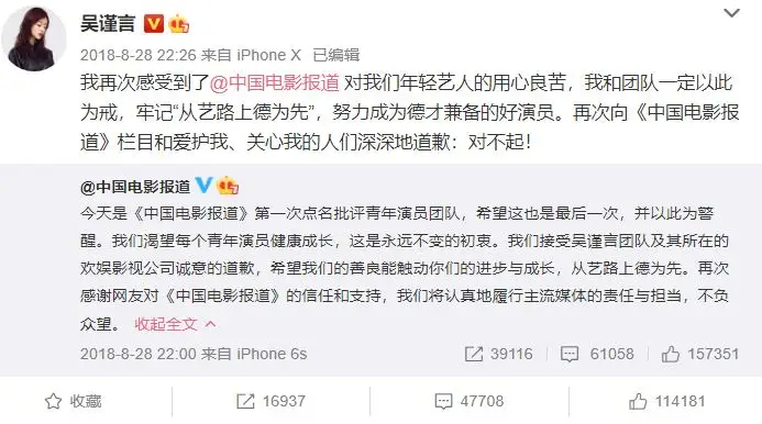 下面是六公主的批评微博 ![]() 在被点评批评后,吴谨言迅速出来道歉,不过这一次负面时间,彻底把她大火的风头给压了下去,很多人“粉转黑”,对她的好感度大大下降。 虽然央视最后表示接受吴谨言的道歉,但是这对于吴谨言来说口碑的崩塌,对于她以后的发展影响极大,虽然并没有封杀她,可是再也没有资源再敢找上她,就连在于正的拜年海报中,也能看出吴谨言的番位不复存在。 ![]() 不过今年随着吴谨言新剧《尚食》的上映,吴谨言的人气再度提升,希望吴谨言这次能把握好千载难逢的机会,好好树立自己的正面形象。 ![]() |