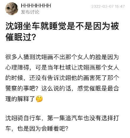 ![]() 大家都知道,沈翊一上车就睡觉,在热搜上还被网友调侃为“睡美人”,其实这是不是就是一个伏笔?沈翊坐车就睡觉是不是因为被催眠过?所以或许沈翊每次去案发现场都选择骑自行车,而不是打车是一个伏笔?很多人猜测沈翊画不出那个女人的脸是因为心理障碍,可是当年杜城让沈翊画那个女人的时候,还没有告诉沈翊他的画害死了那个警察的事吧?这么说的话,感觉催眠是最合理的解释了…