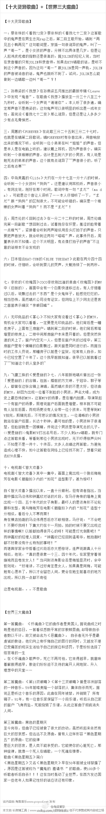 ![]() 此外,蔡依林歌曲灵异事件也是在社交平台上被大家广泛讨论的一件事。 这首歌指的是《看我72变》据传里面有鬼声。 蔡依林的《看我七十二变》这首歌中的鬼声是在男生念完rap之后,第二段主歌开始,唱到“再见丑小鸭再见”这句歌词里,穿插一句很诡异的鬼声,叫了一声“哥…”,是小女孩的声音,分辨不出具体是几岁。 还有网友说:“昨晚看灵异故事,文章里说要讲述发生在身边的灵异歌曲,然后脑海里就开始自动循环蔡依林的《看我七十二变》,手势再往下一滑,蔡依林《看我七十二变》就出现在了眼前。。” 也有网友在KTV点蔡依林歌的时候遇到了灵异事件:“前几天看的ktv真实灵异事件,说点的蔡依林的说爱我,不管怎么切歌,怎么置顶,这首歌就是放不出来,唱歌的人也没多心可能觉得歌曲有问题之类的,结果唱完了要走的时候,这首歌放了,但是不是从第一句开始的哦,只唱了一句“还窃喜你没发现我躲在角落” ” 想想都感觉背后发凉、瘆得慌。。。。 最后是网友列出来的十大灵异歌曲,大家可以试试真的假的: ![]() |