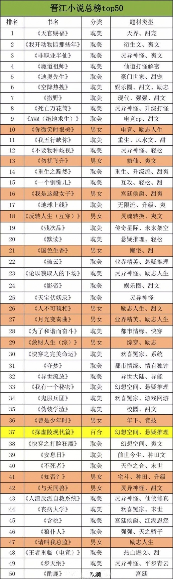排名 书名 题材类型 1 《天官赐福》 天界、甜宠 2 《我开动物园那些年》 衍生文、爽文 3 《非职业半仙》 灵异神怪、爽文 4 《魔道祖师》 仙道打怪揭秘 5 《迪奥先生》 豪门世家、甜宠 6 《空降热搜》 娱乐圈、甜文、励志 7 《撒野》 现代、强强、甜文 8 《死亡万花筒》 灵异神怪、升级打怪 9 《AWM(绝地求生)》 电竞cp、甜文 10 《你微笑时很美》 电竞、励志人生 11 《我五行缺你》 重生、风水文、甜 12 《不要物种歧视》 灵异神怪、轻松 13 《勿扰飞升》 修仙、爽文 14 《重生之豁然》 重生、升级流、甜爽 15 《一个钢镚儿》 互攻、轻松、甜 16 《我是这般女子》 宫廷侯爵、甜爽 17 《地球上线》 无限流、升级、爽 18 《反转人生(互穿)》 灵魂转换、爽文 19 《残次品》 传奇星际、未来架空 20 《默读》 悬疑推理、轻松 21 《国色生香》 懒宅、甜 22 《破云》 业界精英、悬疑推理 23 《论以貌取人的下场》 灵异神怪、励志人生 24 《影帝》 娱乐圈、甜文 25 《天宝伏妖录》 灵异神怪 26 《人不可貌相》 励志人生、甜文 27 《月光变奏曲》 业界精英、励志人生 28 《为了和谐而奋斗》 都市情缘、快穿 29 《敛财人生(综)》 综穿、励志 30 《快穿之完美命运》 欢喜冤家、系统 31 《夺梦》 都市情缘、情有独钟 32 《异世流放》 异世大陆、异能 33 《我有一个秘密》 幻想空间、悬疑推理 34 《鬼服兵团》 欢喜冤家、游戏网游 35 《伪装学渣》 校园、甜文 36 《曾是少年时》 年下、竞技 37 《探虚陵现代篇》 幻想空间、悬疑推理 38 《快穿之打脸狂魔》 幻想空间、爽文 39 《安息日》 前世今生、种田文 40 《不死者》 天作之合、末世 41 《知否?》 宅斗、种田、升级 42 《与天同兽》 灵异神怪、甜文 43 《人渣反派自救系统》 灵异神怪、仙侠修真 44 《丧病大学》 欢喜冤家、末世 45 《含桃》 宫廷侯爵、江湖恩怨 46 《狼仆人》 强强、天之骄子 47 《请叫我总监》 励志人生 48 《王者重临(电竞)》 热血燃文、甜 49 《步天纲》 灵异神怪、平步青云