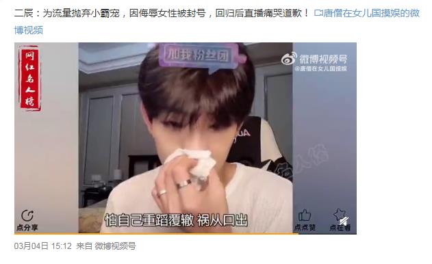 ![]() 当初二辰被网传永久封号,实际不是永久的,封了2个月,现在早已经解封了,被封号的原因是侮辱女性。经常在直播间你讲黄段子,经典语录有:“有X不X,大逆不道”,“X就是用来X的”....至于X代表了什么,大家脑补。 ![]() 而就在2022年3月31日,二辰再次登上微博热搜,这次他是因为直播间你聊到前任复合的问题。 粉丝问前任找你复合怎么办?二辰说复合不了!你当都没找过我?不知道去年怎么了,不到一年时间,除了小学跟结婚那个,剩下三任都喝多给我打过电话,不止一次找我复合,我也不知为啥,还有非要过来找我的! ![]() |