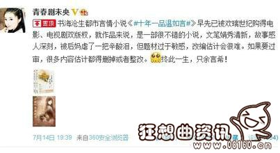 在我们这一代人心中,网络小说是我们的青春记忆,看着他们一个个的搬上银幕,总感觉像是把自己的青春回去,如今又有一部经典小说要被搬上荧幕了。那就是《十年一品温如言》,这部曾经的经典之作会不会被毁?让我们默默祈祷吧。