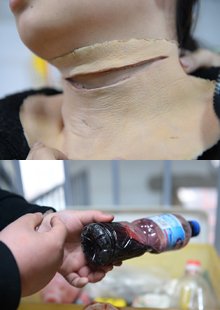 刘吉向记者介绍:“拍摄割喉戏时,我们先在演员脖子上贴上一层很薄的硅胶假皮,里面夹着很多条装有人工血浆的导管。导演一喊开拍,演员用刀子割开脖子上的假皮,躲在后面的工作人员就迅速地通过导管,将血浆挤出来,造成喷血的效果。”