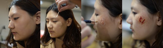 化妆师表示,脸上的伤痕妆要求非常高,仅是一个头部要分额头、脸颊、下巴、鼻子和脖子五个部分,每个部分的要求都不同。不过,正如之前所说的,基础都是靠硅胶,但是做伤痕的硅胶要非常非常薄,尽量像皮肤一样,然后化妆师便要在这层薄薄的硅胶上施展自己的本领。
