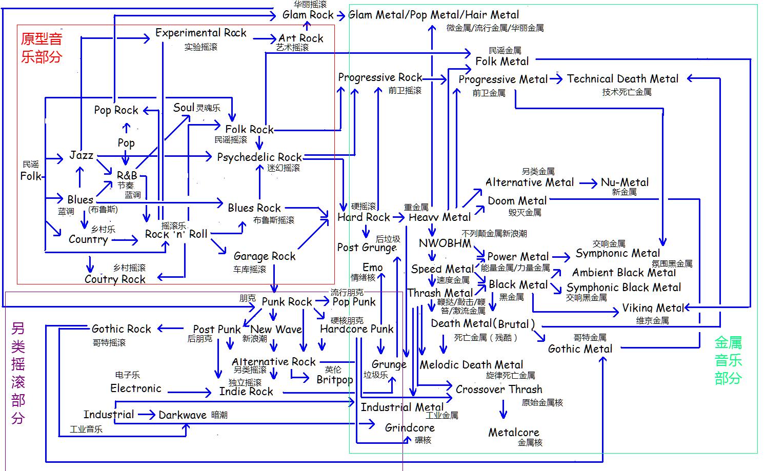 1.对力量的表达方式不同,早期摇滚强调用节奏来表达力量,就算清唱或者民谣伴奏也能感觉到饱满盈动;后期金属的力量则依赖电吉他,而且只能用电吉他,用节奏以外的旋律和线条来诠释力量,和最初的摇滚偏差很大(摇滚乐并不是因为有了电吉他才成为摇滚的,可是没有电吉他就没有金属乐,或者也可以说就算没有摇滚乐只有电吉他照样会造就金属乐);