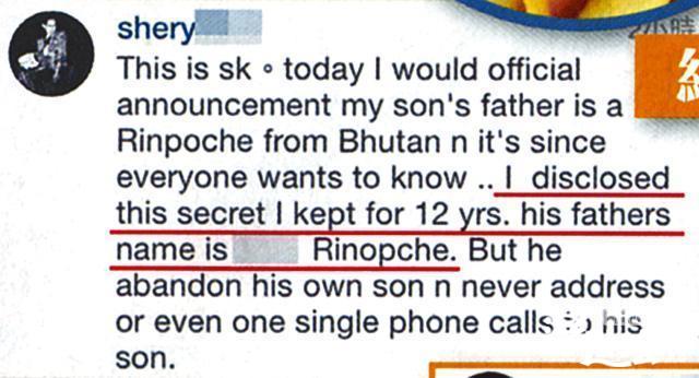 直到2014年,关淑怡才在IG上以英文自曝孩子生父是不丹活佛,她指责对方历年来对儿子漠不关心,连电话往来都没有,完全是零联络。她发文之后,又删除了这条内容。