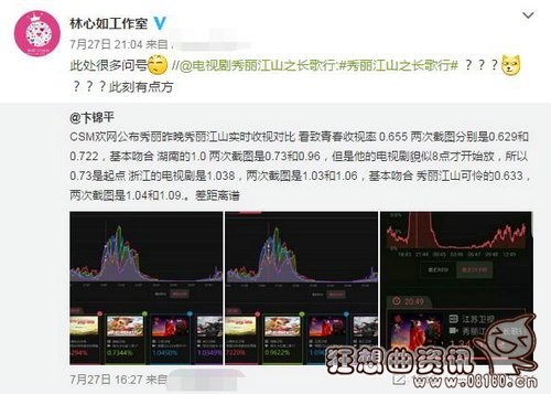 7月27日,有网友曝料电视剧《秀丽江山之长歌行》的实施收视不符合最终收视,并晒出收视截图。随后,该电视剧官方微博和林心如工作室都转发了该微博。林心如工作室表示“此处有很多问号”,质疑电视剧被偷收视。