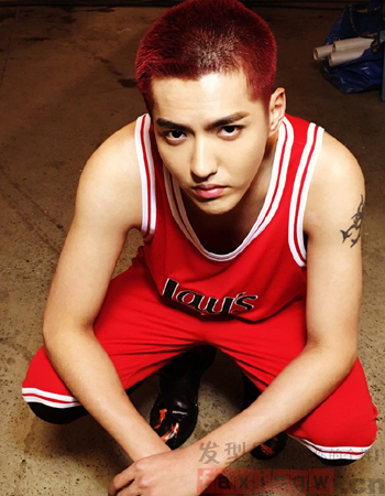吴亦凡的这款板寸头大胆采用红色的染发,跟一身红色球装看起来更加更配,露额的设计也让五官变得更加立体了。