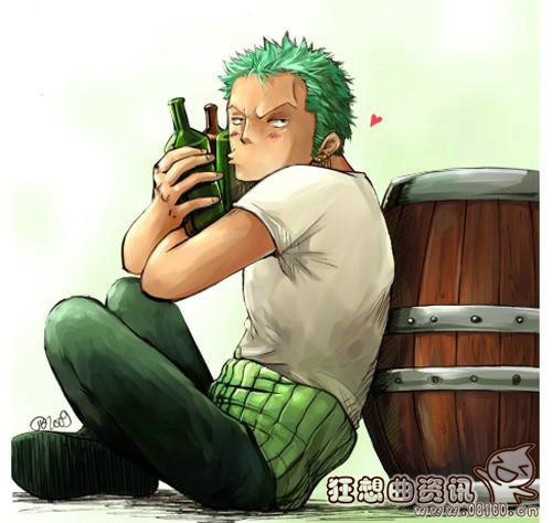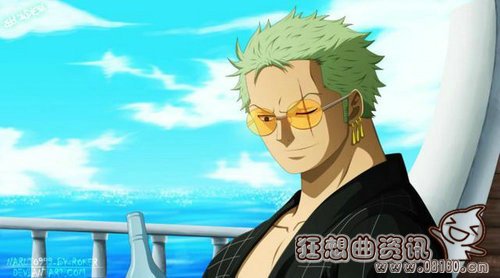 海贼王中的剑客罗罗诺亚·索隆,帽海贼团副船长、剑士,绿色头发,左耳戴三只黄色露珠耳环,绿色的肚兜 ,腰带上佩三把刀。