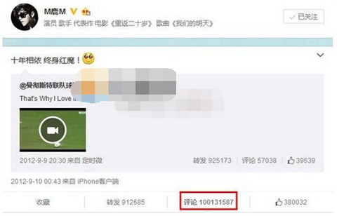 ![]() ![]() ![]() ![]() ![]() 鹿晗什么微博破吉尼斯记录? ![]() 如果小编告诉你,一条微博的评论数量能达到一亿多条,你敢信吗?看似不可思议的这件事,就发生在当红小鲜肉鹿晗的微博上,甚至还打破了吉尼斯世界。不禁让小编感叹明星的娱乐效应真强大,粉丝的力量更加强大。鹿晗破吉尼斯世界纪录微博内容是什么? ![]() 9月25日,吉尼斯世界纪录正式宣布鹿晗于2012年转发的一条微博,截至9月2日共获得了100,252,605条评论,刷新了去年由他本人创造的微博上最多评论的博文的纪录,吉尼斯世界纪录认证官Brittany Dunn现场为鹿晗颁发证书。 ![]() 2014年8月5日,鹿晗在2012年9月10日转发自曼彻斯特联队球迷俱乐部的微博共获得了13,163,859条评论,首次创造了上最多评论的博文的纪录称号。时隔一年,在粉丝的不断关注及支持下,这条微博目前评论数已攀升至一亿多条,使鹿晗再度刷新纪录,稳坐纪录保持者的宝座。 |